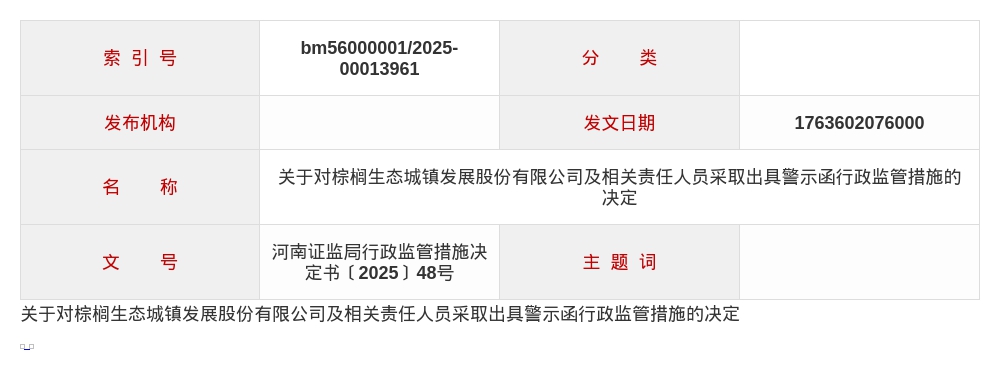 针对上述违法违规行为,河南证监局决定对棕榈生态城镇发展股份有限公司、汪耿超、余海军、冯玉兰采取出具警示函的行政监管措施,并记入证券期货市场诚信档案。