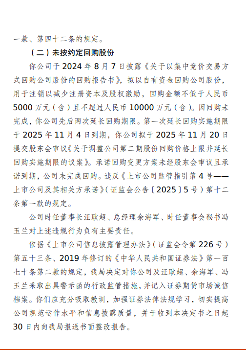 公司时任董事长汪耿超、总经理余海军、时任董事会秘书冯玉兰对上述违规行为负有主要责任。